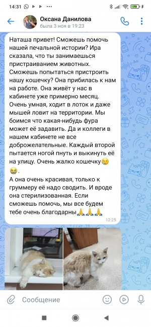 1. Кошечка Зося, была забрана из подвала, тяжелоё заболевание МКБ, удалены камни оксолаты, нуждается в лечебном корме Уринари пожизненно.