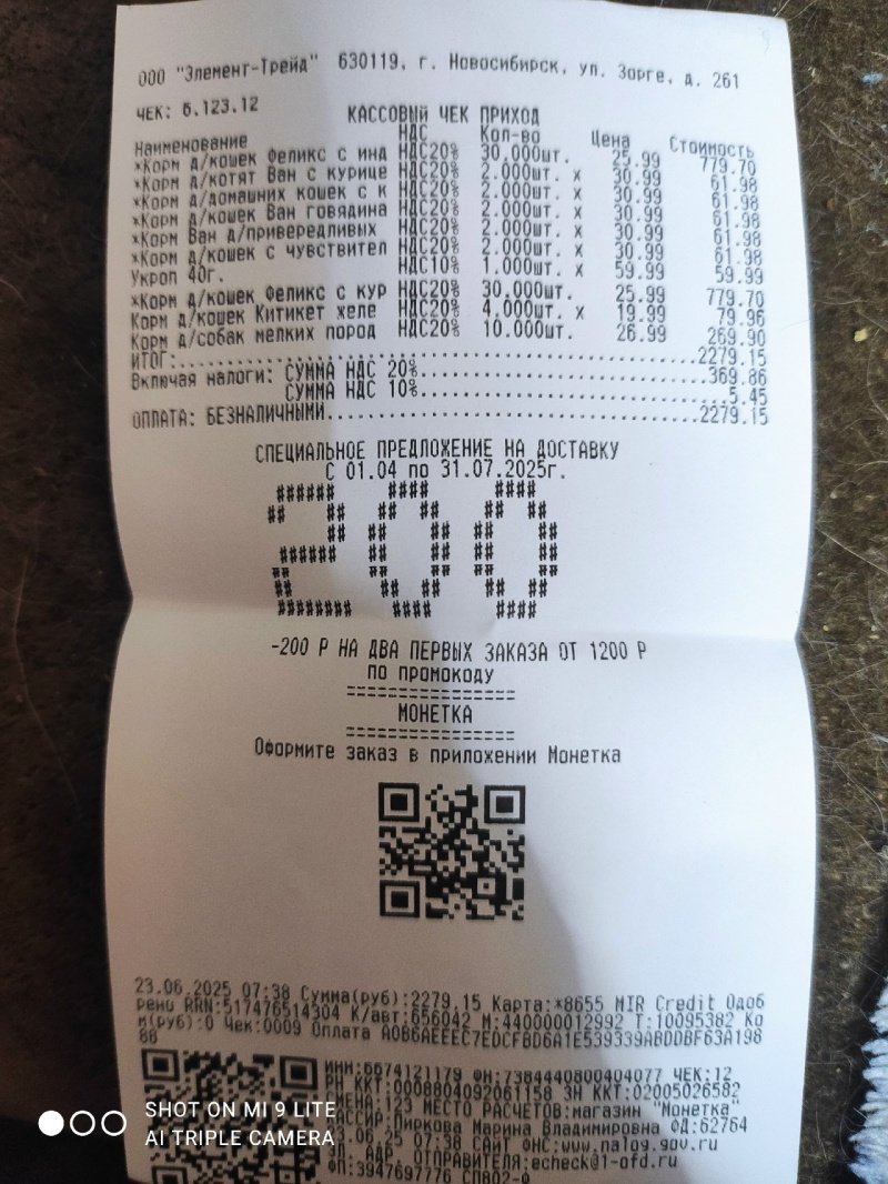 2. Сухой корм для котят РК + сухой корм для кошек Гастро-Диета на общую сумму: 1,132руб.