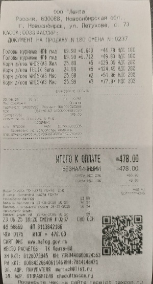 12. Головы куриные, корм для кошек паучи " Вискас ", " Феликс " на общую сумму: 478руб.