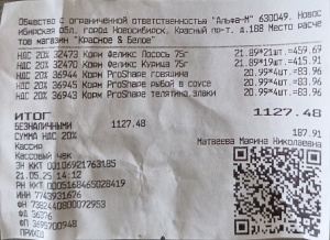 11. Корм для кошек паучи " Феликс " на общую сумму: 1,127руб.