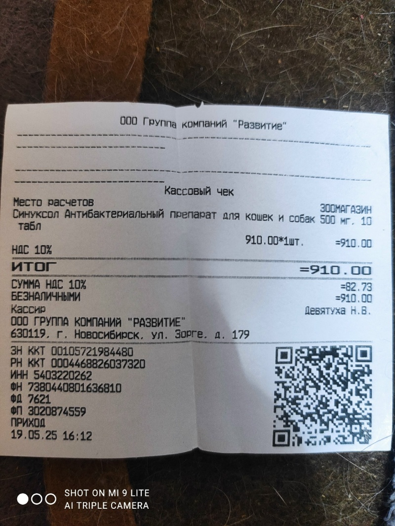 6. СИНУКСОЛ ветеринарный антибиотик 1шт.х 910руб.