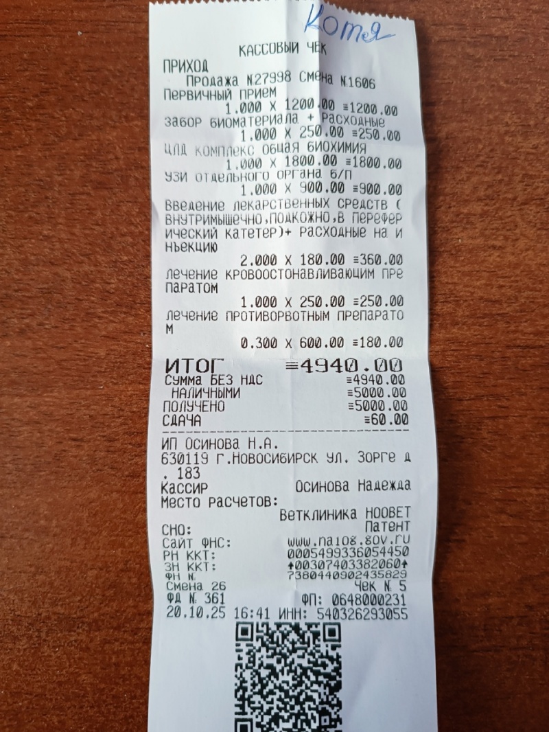 1. Ветеринарные услуги за котика Котю ( УЗИ, биохимия крови, общий анализ крови ) на общую сумму: 4,940руб. (20.10.2025г. )
