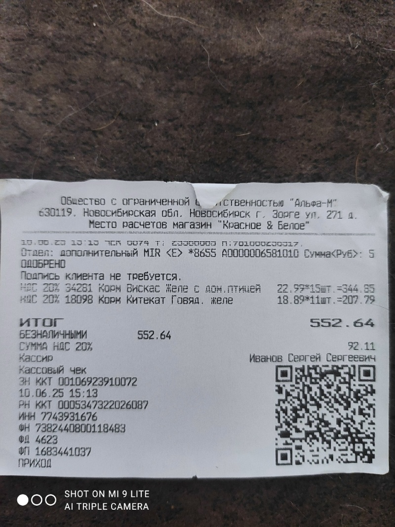 3. Корм для кошек паучи " Вискас ", " Китикет " на общую сумму: 552руб.