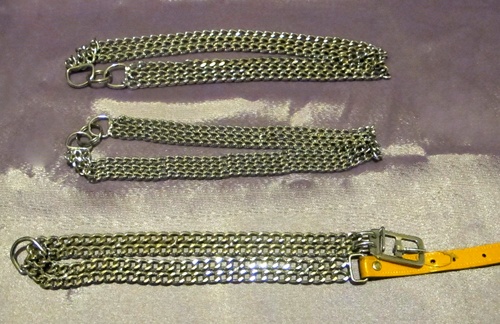 Одна шлейка кожаная есть но очень маленькая. Есть несколько штук поольше примерно как на кокера ....или француза.