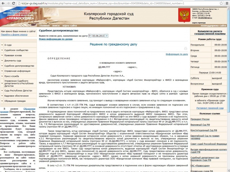 О ДВУХ неудачных попытках взыскать гражданский иск в суде Дагестана по ненадлежащим доверенностям от Майкрософт и Адобе с одного и того же гражданина Дагестана в течении 2012 -2013 годов