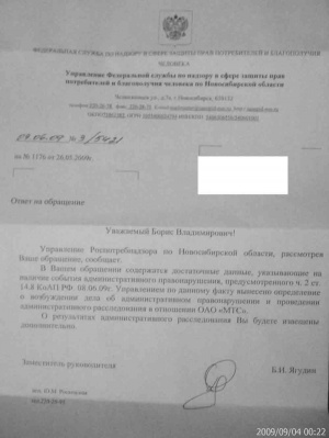 По моему заявлению ПотребНадзор начал проверку, я ему помогал собирать данные для админстративного дела. Дело возбудили. Но там МТС штрафом отделается, им это 'как слону дробина'.