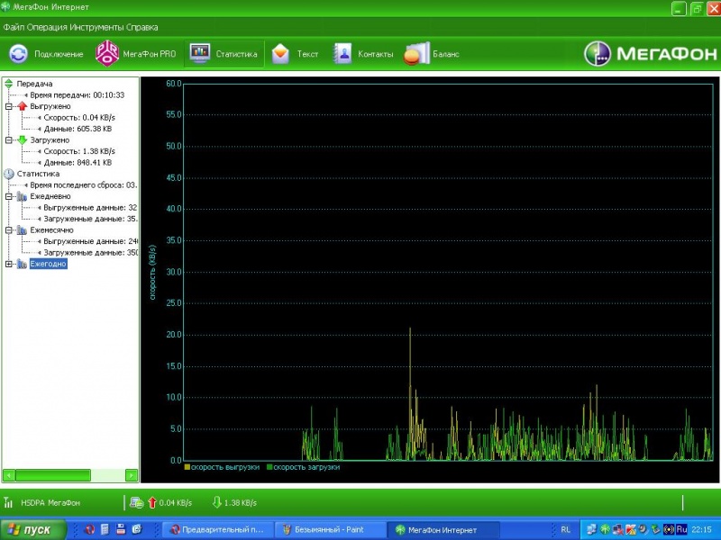 В связи с отсутствием альтернативы возникла необходимость приобрести USB-модем для обеспечения мобильного доступа к Интернет. И угораздило меня приобрести SIM-карту с тарифным планом МегаФон и USB МегаФон-модем Huawei E1550. Скорость, а скорее тормоз была в среднем 4 Кбит/сек. Постоянно прерывалась связь, уровень сигнала в норме. Скриншот прикрепил. Работать просто не возможно, только если СМС-ки отправлять можно :). От времени суток ситуация не меняется, только если в худшую сторону. Решил я по горячим следам сдать это барахло обратно в Мегафон, а они говорят, что "...у вас же все работает, а кто говорил, что будет все летать... Модем обратно принять не можем..."
