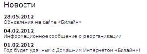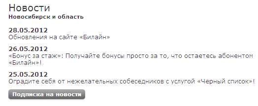 Сайт "Beeline.ru" (регион Новосибирская область), раздел "Частным клиентам", далее "Мобильная связь", затем "Новости".