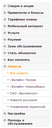 Из меню раздела "Новости" видно, что они делятся на "«Билайн» Россия", "«Билайн» Новосибирск", "ОАО «Вымпелком»" (я с трудом представляю, как пользователь будет понимать это деление). Я захожу в новость "Информация для пользователей мобильного интернета!" (вложения уже не помещаются). Вверху страницы новости есть адрес по которому я нахожусь, а именно: "Мобильная связь / Новости / «Билайн» Сибирь". Оказывается, еще есть раздел "«Билайн» Сибирь"... Захожу в раздел "«Билайн» Новосибирск", вижу эту новость, захожу в нее, теперь адрес указан такой: "Мобильная связь / Новости / «Билайн» Новосибирск". Зачем создавать столько дублирующих страниц остается не понятно (но это должно объяснить почему у страниц на сайте "BeeLine" такие странные адреса).