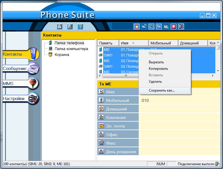 У меня лично этого телефона нет, кабеля к нему тоже, ремонтом и настройкой телефонов я профессионально не занимаюсь и на этом не зарабатываю. Но что mobileedit не показывает контакты как-то не верится.