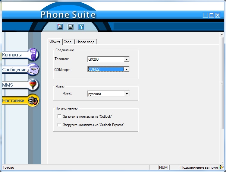 В настройках есть "Загрузить контакты из Outlook". По причине отсутствия - не пробовал. По "Сохранить как" контакты сохраняются в обычный текстовый файл. Кстати, если в этой программе выставить контактам дни рождения, они будут отображаться и в телефонной книге GX200. В телефоне при создании контакта выставить день рождения нельзя (возможно, из-за не самой свежей прошивки).