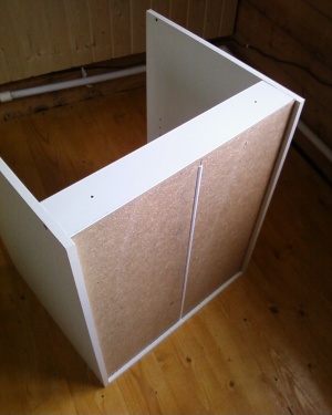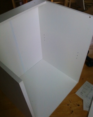 Следующий слайд - шкафчик почти собран, видно составную заднюю стенку и три присадки для полкодержателей. Можно бы и поболее уровней высоты - но ладно, и так неплохо.