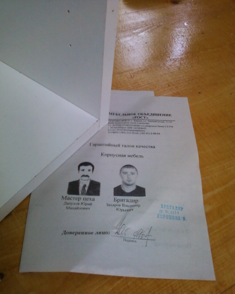 Ну, ладно, забрал-привёз-собираю. Всё равно в стопицот раз меньше гемора, чем с работой под заказ. Упаковано на пять с минусом, см. слайд. Не совсем аккуратно подрезан картон, но по сути придраться не к чему. Внутри, см. слайд - детальки и в отдельной коробочке (не поцарапает!) фурнитурка. Задние стенки шкафчиков от 60-ти - составные, мне пофигу. В каждой упаковке - инструкция, а в некоторых - аж Гарантийный талон качества, см. слайд. Кореляцию между наличием талона и качеством отдельных изделий найти не удалось.