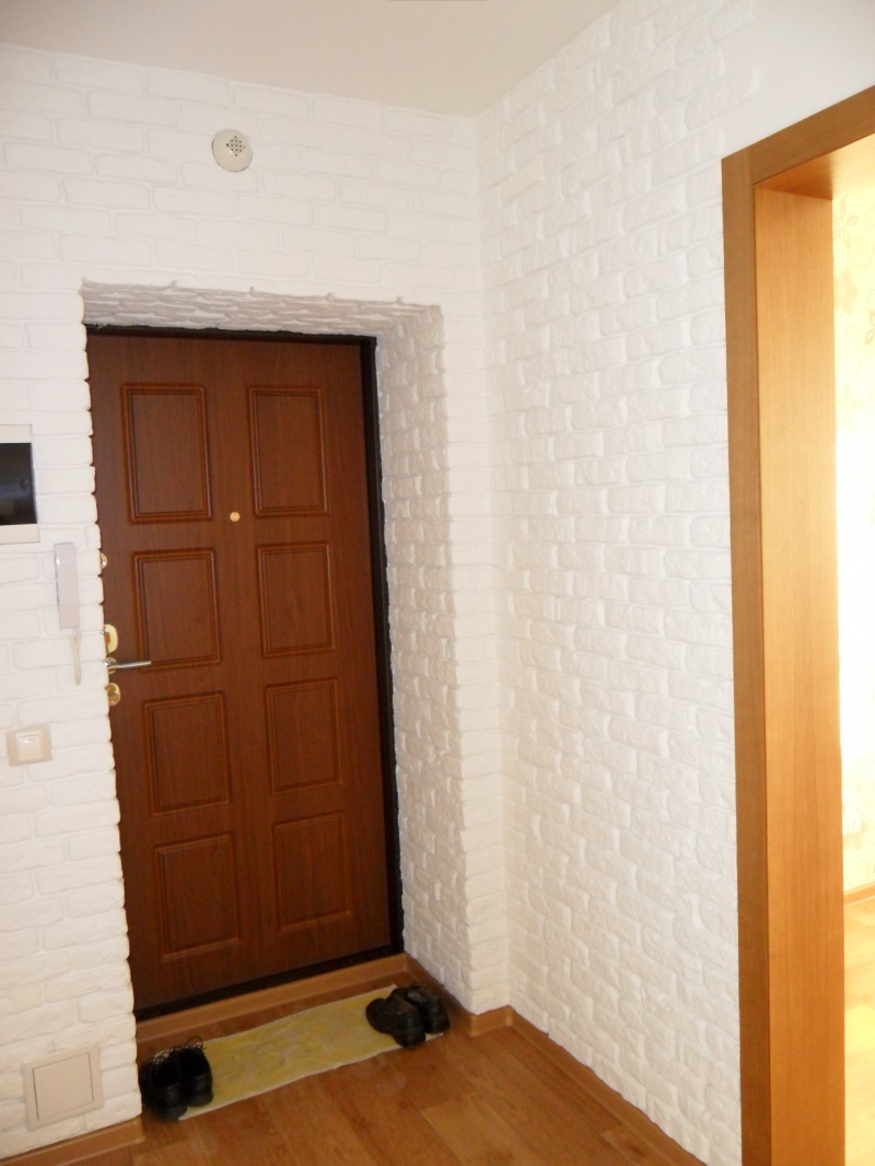 Насчет белого-не знаю. Может быть и неплохо будет. Смотря какой шкаф.Нет, шкаф будет начинаться от угла у двери санузла, заканчиваться напротив входа в комнату. Между шкафом и кирпичиками будет кусок гладкой стены, прямо напротив входа в комнату.