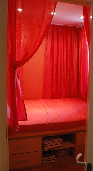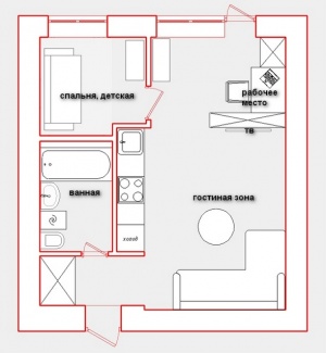 Это 1к.кв 32.8 кв м в кирпичном доме. В детской 5.8 м.кв, комната 21 м.кв. Тесно стало только с 2мя детьми. А когда еще детей у меня не было, в маленькой комнате была спальня.... почти все ее пространство занимала кровать как бы встроенная с выдвижными ящиками вод ней,оформленноая в виде алькова, только вдоль стены, граничащей с комнатой был проход. А из ванной в спальню было окно с раздвижной дверью, ванна получалась на одном уровне с кроватью. Можно было устраивать романтическую ванну с непосредственной возможностью переместиться на кровать....