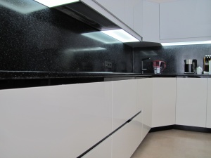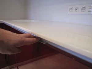 можно поподробнее фотки? как ручка сделана в фасаде? что у вас между фасадом и столешницей?
