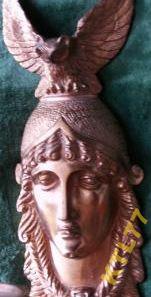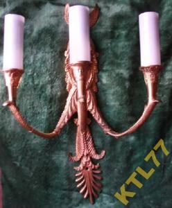 Прекрасное, шикарное бра "Богиня Афина". Изготовлены они в 1989-90 гг в Санкт-Петербурге группой мастеров художественного литья и ручной прочеканки с НАТУРАЛЬНЫХ образцов стиля Ампир (18 века). Богиня Афина, очень тонко проработаны черты лица, легко узнается классический греческий профиль. На головном уборе Богини Афины сидит Сова, широко расправив крылья, на которых отлично видно каждое перышко, широко раскрытые глаза, уши совы и трехпалые лапы с когтями. Все очень четко проработано ручной прочеканкой. На держателях свечей (ламп) хорошо видны лица мужчин в богатых головных уборах. Очень тонкое литье, затем ручная прочеканка. Адаптированы под патроны с лампами "миньон" 40 вт. При этом патрон лампы закрыт белым стеклянным плафоном под свечу и соединен тонкими проводами в тефлоновой оболочке, которые выведены на тыльную сторону бра для соединения с электросетью 220 В. Бра состоит из 5-ти литых деталей на скрытых винтовых соедининиях. Высота 360 мм, ширина 280 мм. Покрыты лаком, но есть пара бра без лака, уже с патиной.