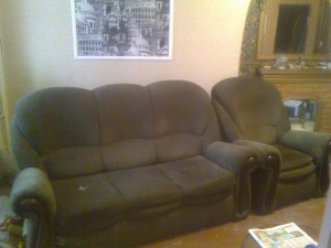 Продается комплект: диван-кровать + 2 кресла, цена 3000 руб. Состояние удовлетворительное, механизм в рабочем состоянии. В квартире курили.