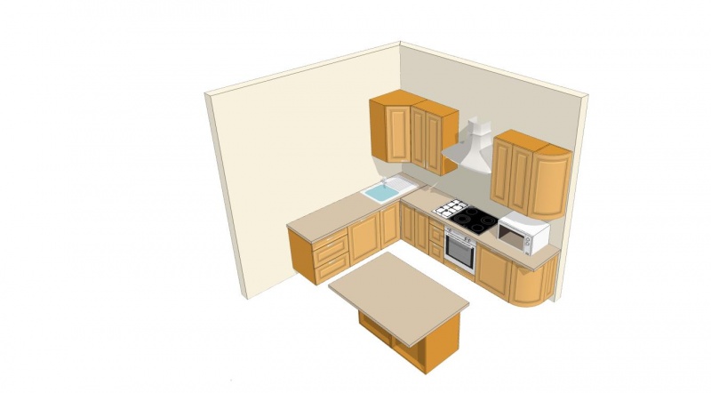 Нужна угловая кухня, по одной стене 3 метра, по другой 2,1 метра + остров. Кухня классическая, но с минимумом декора, стиль деревенский такой, фасады из массива, хорошая фурнитура, столешница пластик, мойка искусственный камень. Из встроенной техники электрическая варочная панель на 4 конфорки + газовая на 2, духовка, посудомоечная машина.