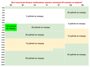 Добрый день! В связи с увеличением количества заказов, с 4-х утра понедельника (08.02.16) мы изменяем бонусную сетку. Доплата за каждую поездку составит 140р или 90р в зависимости от дня недели и времени суток. Для получения бонуса необходимо совершить не менее 12 поездок за неделю. Предыдущая схема прекращает свою работу. Хороших поездок! Команда Убер.