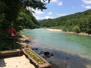 У нас была группа из новичков, поэтому мы проходили через средней сложности участок, он почти без порогов. Но один раз чуть не перевернулись. Делали несколько остановок - у водопада, просто искупаться. Потом уже на конечной точке душ, вкуснейшее мясо под сачем и ракия.