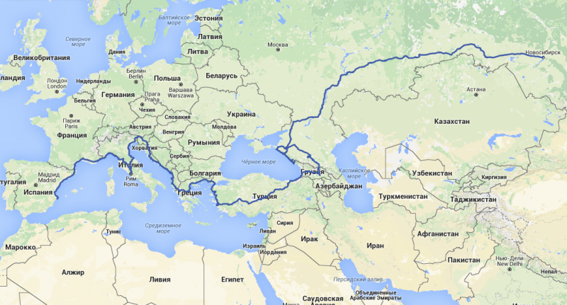 Россия-Абхазия-Россия-Грузия-Турция-Греция-Албания-Черногория-Хорватия-Словения-Италия-Франция-Испания.
