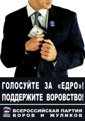 я законными способами выражаю. на выборах. видимо я и другие - в меньшинстве. раз результаты выборов из в года в год одни и те же.Для победы на выборах Партия мошенников, жуликов и воров активно использует административный ресурс и средства массовой информации. Когда с телеэкранов все вокруг говорят о победах и достижениях, то вся аморфная политически неактивная часть общества или не ходит на выборы, или идет и голосует за тех, "которых всегда хвалят". Наша маленькая задача - развеять состояние идиллии в их головах. И тут все способы хороши.