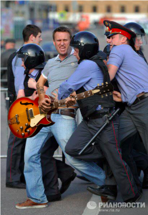 "...Тарасов Павел с натуральным муляжом АК-74 гулял по городу 9 мая. Гулял от Лубянки до Пушкинской площади мимо Гос.Думы, мимо Манежки, по Тверской, мимо мэрии, по Пушкинской. И ни один мент не остановил его!!!! Ни один! Наблюдать это было смешно и страшно. Если бы у меня была бы белая ленточка - забрали бы через 10 метров. А человек, тусующийся с АК никого не интересует. Господа полицейские просто смотрели на него, но тут же переводили взгляд в сторону. Вот и хочется спросить, а что же делает наша полиция на самом деле? Забирает студентов и бьет женщин? Или же охраняет общественный порядок? По итогам, работа полицейских - твердая и жирная единица. Даже не двойка. Не заслужили. А единица за задержанных людей гуляющих там же с белыми лентами, вдруг Кремль взорвут. " "Эксперимент" или "Наша полиция - нас бережет"