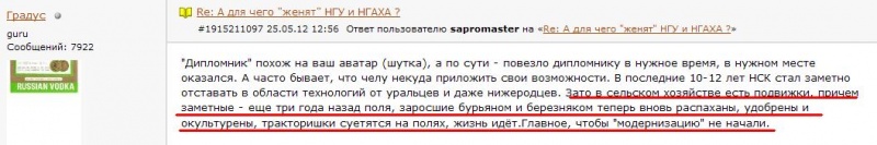 Думаю, что если привести аналогичные таблицы для Ленинграда начала 1930-х годов, то из них никак не будет видно голодающего Поволжья, Украины или Казахстана.Ну, Вы же понимаете, что в те времена интернета не было и статистические данные не выкладывались на сервер. Кроме того рабочий класс в те времена концентрировался в столицах. А что касается крестьянских хозяйств, так ведь хозяин сперва заполнит свои закрома, а потом продаст излишки, в том числе и на экспорт. Но вопрос не в этом. Вопрос в том, что Российская Империя не боялась конкуренции на рынке зерна, и не только зерна, но и других сельскохозяйственных продуктов. То, что сегодня возрождается экспорт зерна, а это возобновляемый ресурс, меня лично радует. Да и православно-монархическая идеология мне гораздо ближе, нежели идеология дяди Гены, которая направлена на то, чтобы любой ценой пройти в Госдуму и стричь купоны, хотя бы в виде депутатских зарплат. У современной власти идеологии вообще никакой, она просто выражает интересы крупного капитала, только и всего.