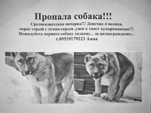 На досках в эл.газетах. "Потерялся лабрадор-сука, черного цвета, клейменая. Потерялась на Северо-Чемском ж/м на улице Чемская 6,8,10. Нашедшем или имеющим информацию о ее месте нахождения вознаграждение.