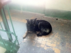 Собака, похожая на овчарку в 2-х ошейниках, в подъезде в центре.