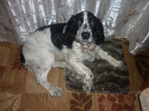 Пес Спаниель раскраска черно-белая,светоотражающий ошейник, достаточно крупный.
