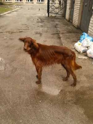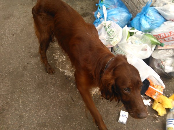 "На верхушке, в районе Ученых 8, бегает рыжий сеттер, в ошейнике!!! Сильно истощен, шарится по помойкам"