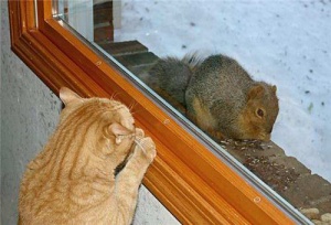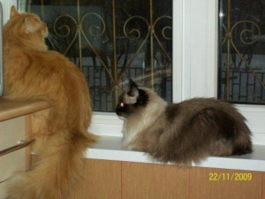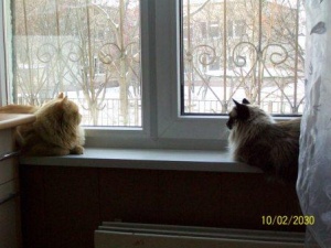 оооой)))) так смяшно! Семен боицо близко подходить к окну, когда птички рядом, а Джеська трясёт бородой и издаёт звук: мя-ммя-ммяк!