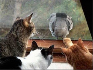 Коти в восторге от шоу "Гули за стеклом", вот только что пережили и обсудили трагический момент - "атака вечно голодных родственников" (голуби прилетали, синичек прогоняли)