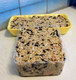 Сюда можно добавить очистки яблок, семена, геркулес, ядра орехов, куриные яйца, сахар, мед, сироп – все, что у вас под рукой. Все хорошо смешайте и выставите на холод, чтобы затвердело. Жидкое тесто можно вылить в картонную коробку или пластиковую чашку и сразу выставить птицам, подвесив на дереве в тени.