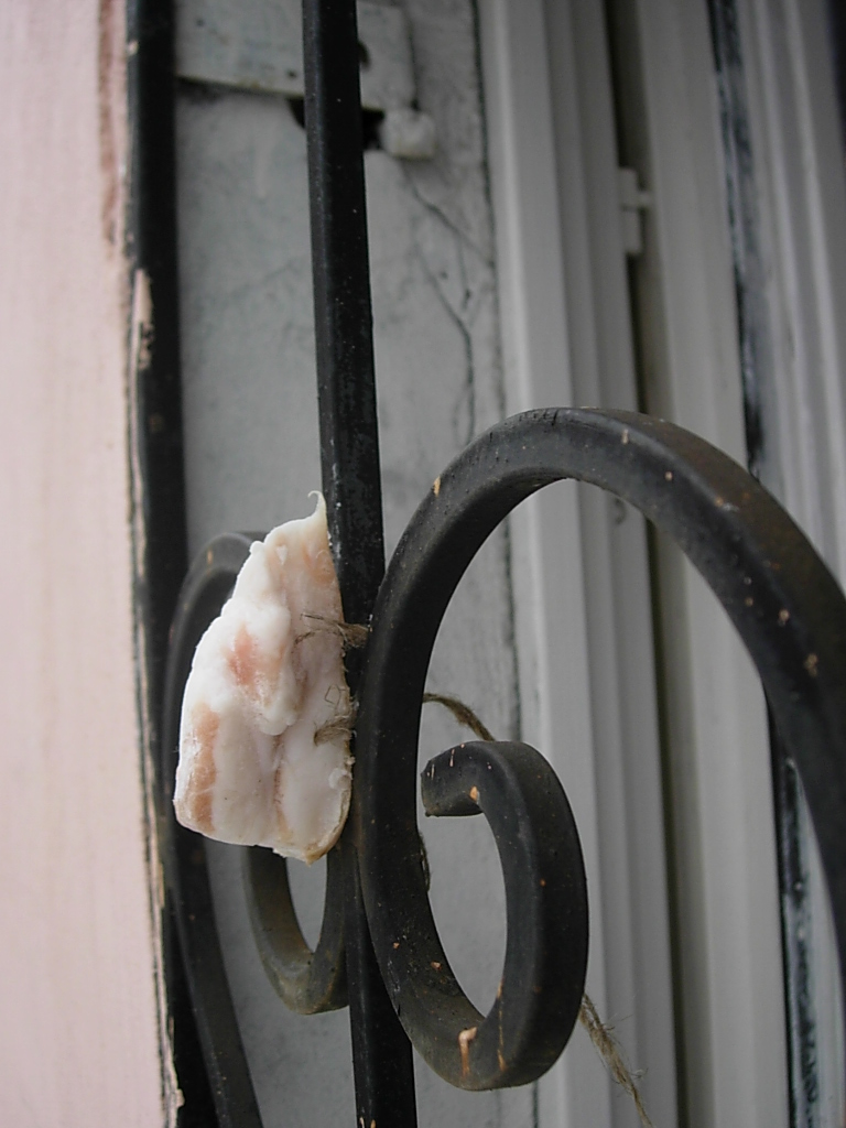 Стоит помнить, что птицам можно предлагать только несоленое сало или мясо. Как правило, кусочки сала нанизываются на бечевку, которая вешается на ветвях деревьев или кустарников.