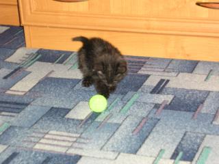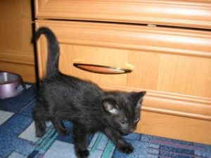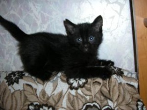 Котенок-мальчик, черненький, средне-пушистенький, кушает домашнюю еду ), знает лоток.