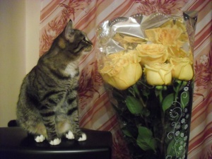 Это редко бывает. Мне пришлось расстаться с цветами, т.к. мои домашние котишки грызут и роняют их. А Рыся такая умничка, только любуется на цветы