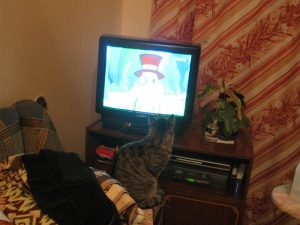 Рысенька любит смотреть "кино" про улицу. Листва облетела, теперь можно смотреть захвтывающие картины из жизни птиц...