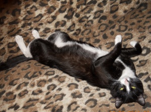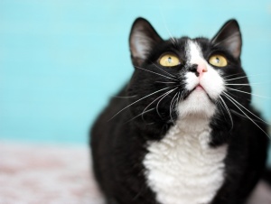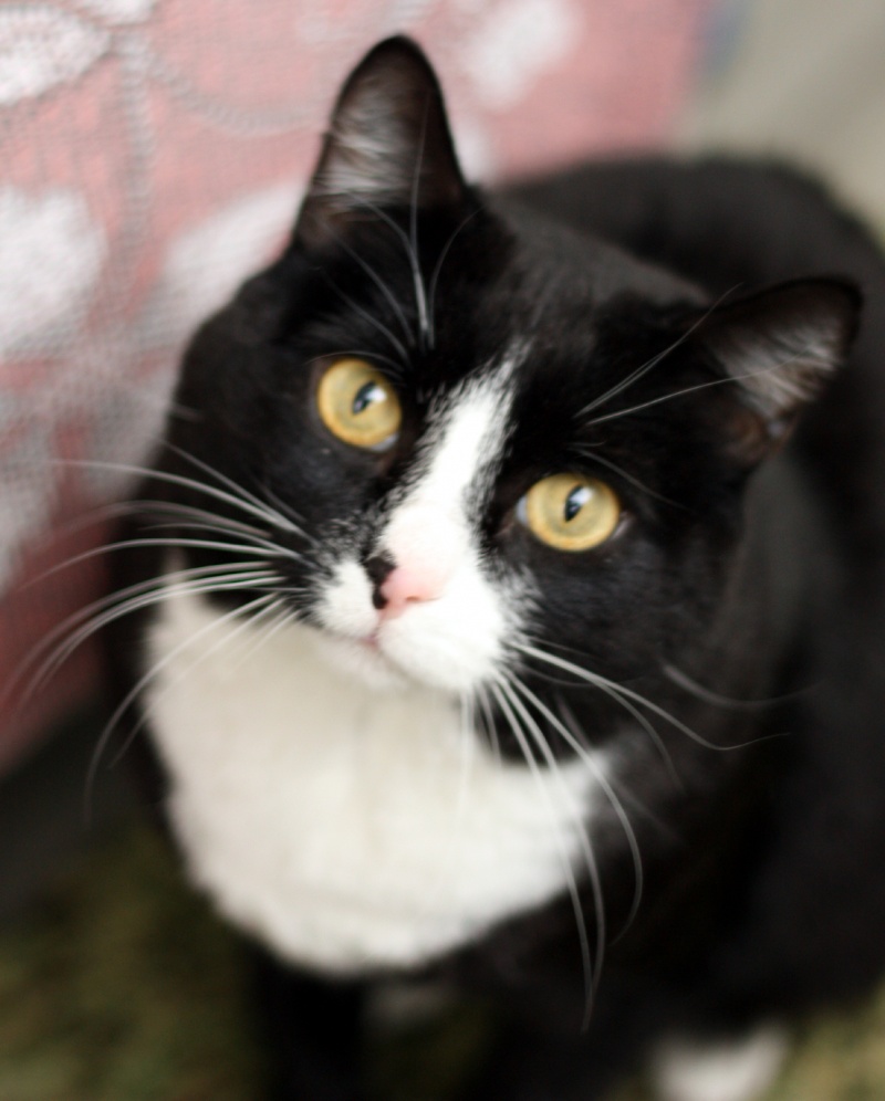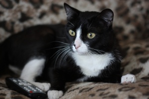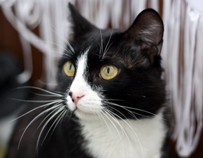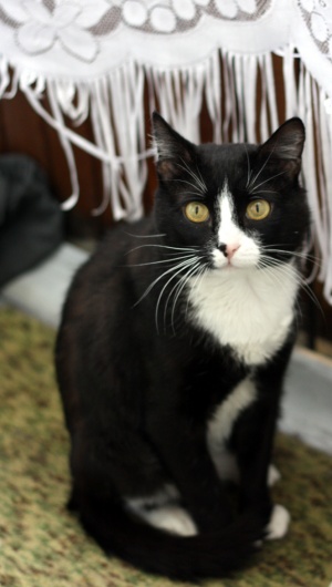 У нашего Кота замечательная блестящая шелковистая черная шерстка, белые манишка и носочки на передних лапках и настоящие гольфики на задних, а также роскошные белые усищи
