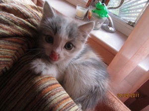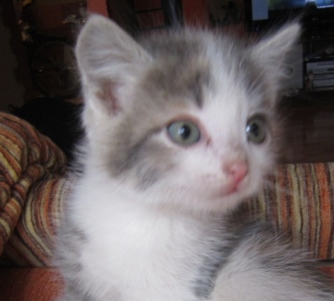 Котенок (девочка) 2.5 месяца, трехцветный:белый\серый\персиковый=)) Приучен к лотку (отдаем вместе с ним), любая пища кроме курицы.Очень веселый и игривый, составит вам компанию в любом деле и вас будет звать поиграть=) Любой предмет для него игрушка, любит играть со своим хвостом и отражением в зеркале=) Всегда встречает в коридоре и отзывчиво урчит на ласку. Дома называем ее Кнопка)