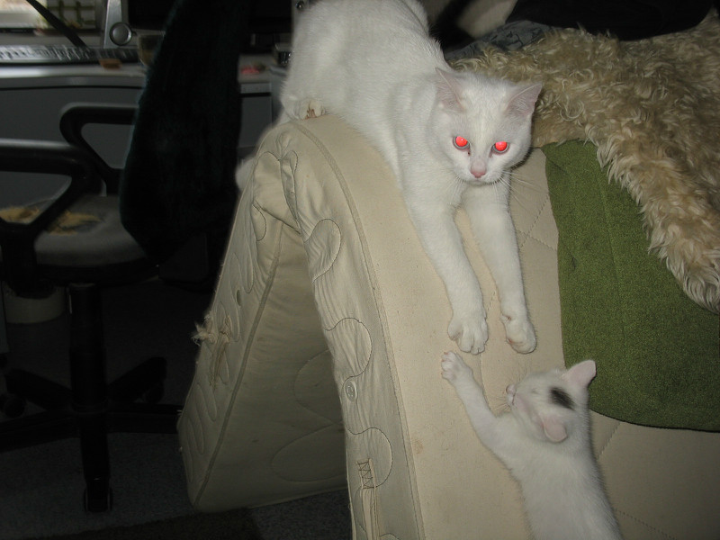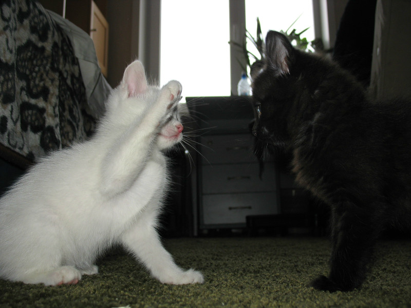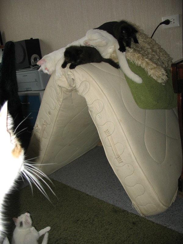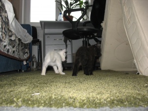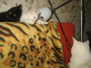 Собака их не тронула .Маленьких обижать нельзя! И через секунду ,все четверо сидели на руках у человека, а человек не знал что делать. Ведь эта история повторяется снова и снова. И у кого-то хватает духа развернуться и уйти, а у кого-то нет. У меня не хватило. И ещё у женщины, которая шла с дочерью мимо. Тоже не хватило духа. И поэтому она забрала одного котёнка с собой. А трое оказались у меня. Белый кот и чёрные пушистые кот и кошка. Дети есть дети, через два дня ужас из глаз исчез, они стали играть и мурлыкать, не бояться эту страшнючюю собаченцию, подружились с моим котом и кошкой.