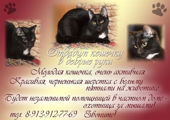 Ищу хорошего хозяина для кошки.Черная с белой грудью, гладкошерстная кошка.Можно в частный дом.Желающим взять на лето на дачу, не беспокоиться.
