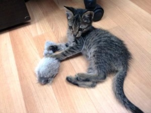 Полосатик оказался самым шустрым и сообразительным, не могла пройти мимо такого шустрика, тем более, что он вполне мог последовать за своими мамой и братиками – сестричками. Теперь временно живет у меня в офисе (т.к. больше поселить его некуда).