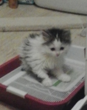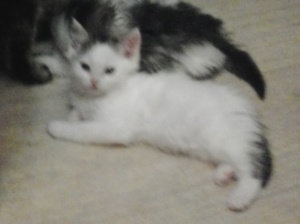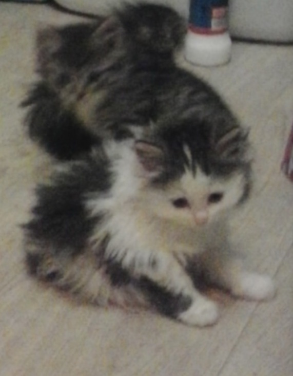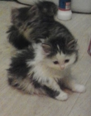 Беленькие с чёрными пятнышками очень пушистые хорошенькие котята-девочки. Возраст - 2 месяца. В меру игривые, в меру - спокойные. Приучены к лоточку с наполнителем. Кушают всё. Тел. 8-905-950-9391