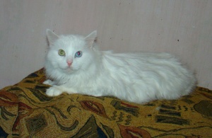 Один глаз голубой, второй - желто-зеленый. Возраст около 5 лет. Очень ласковый и спокойный.