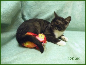 Торик - на первый взгляд такой же черно-белый, как его брат, но шерстка у него дымчатая, очень приметная и красивая. Торик - нежный стеснительный котенок, с одной стороны тянется к людям, с другой слегка опасается, ему нужен чуткий и ласковый хозяин, который растопит напуганное сердечко малыша и подарит ему любовь. Возраст 3,5 месяца
