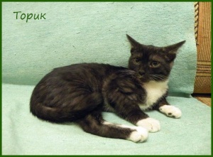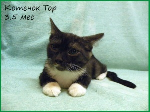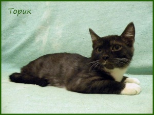 Красивый маленький котенок Торик обладает, на первый взгляд, классическим черно-белым окрасом с белой манишкой, перчаточками и носочками, но шерстка у него дымчатая, очень приметная и красивая. Этот нежный стеснительный малыш с одной стороны тянется к людям, с другой - слегка опасается, ему нужен чуткий и ласковый хозяин, который растопит напуганное сердечко Тора и подарит ему любовь.