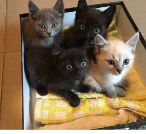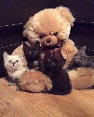 Им примерно по 1,5 месяца, сладкие, хорошенькие, шкодливые. Светленький и один из черненьких – мальчики, голубая и черненькая – девочки. Приведены в порядок и обучаются правилам жизни в квартире.